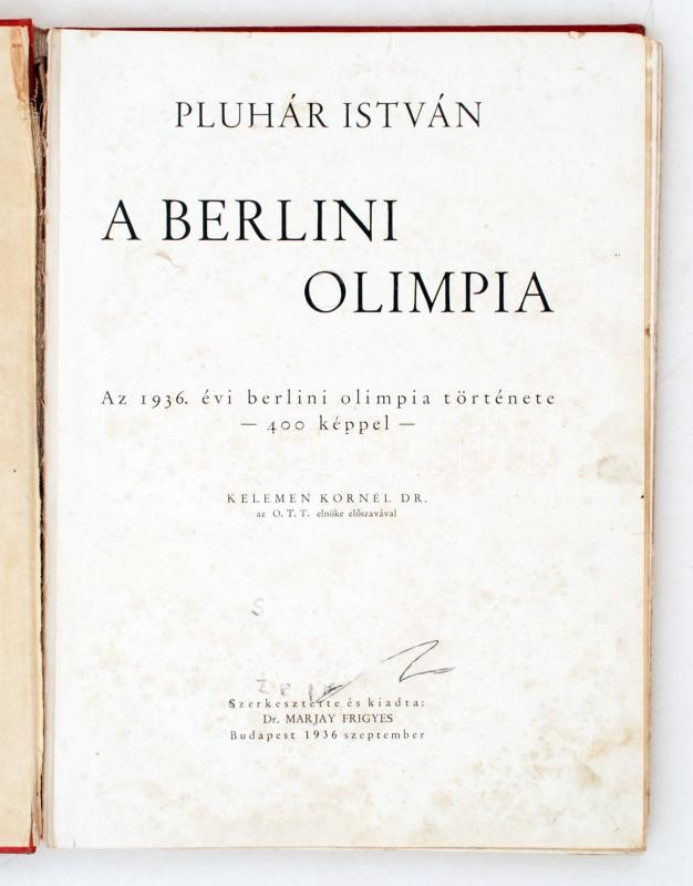 Pluhár István: A berlini olimpia. Az 1936. évi berlini olimpia története 400 képpel. Bp., 1936, Dr. Marjay Frigyes. Aranyozott vászonkötésben, (egy-két lap sérült, sok lap piszkos)
