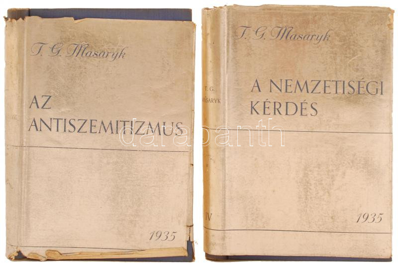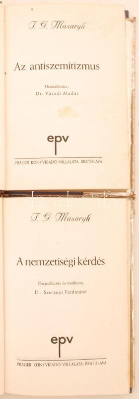 Szerényi Ferdinánd dr.: A nemzetiségi kérdés. AZ Antiszemitizmus. A magyar Masaryk. 4-5 kötet. Bratislava, 1935, Prager Könyvkiadó. Aranyozott kiadói egészvászon kötésben, fedőborítóval. Kissé foltos a szennylap egyébként, jó állapotúak.