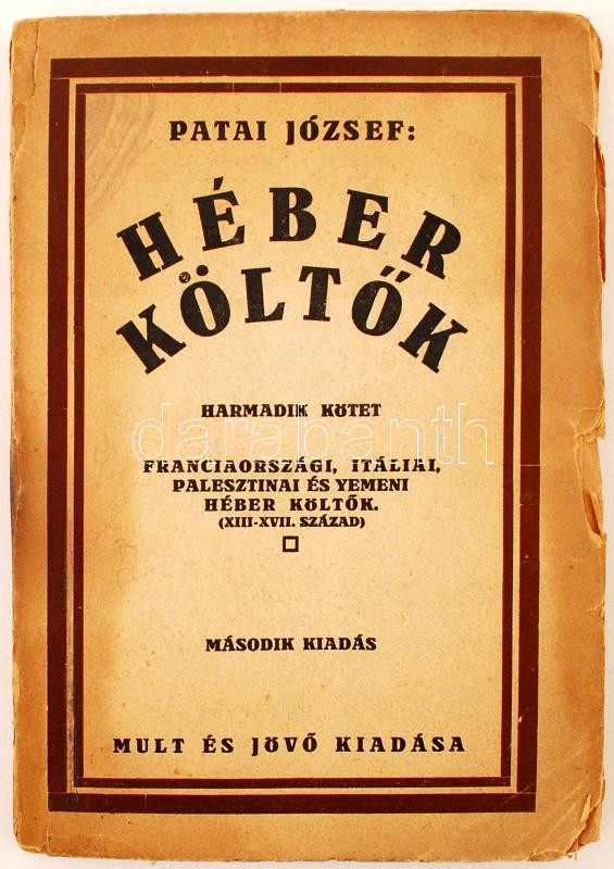 Patai József: Héber költők. Harmadik kötet. Franciaországi, Itáliai, Palesztinai, és Yemeni héber költők. (XIII-XVII. század) Budapest, é.n., Mult és jövő kiadása. Kissé szakadozott, kiadói papír kötésben.