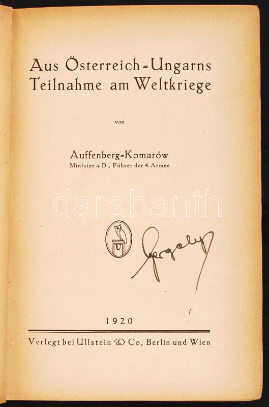 Auffenberg-Komarow: Aus Österreich-Ungarns Teilnahme am Weltkriege. Be... https://www.darabanth.com/de/227-Fernauktion/227.0/Andere-Sammelgebiete/Bucher-Militaria~200319/Auffenberg-Komarow-Aus-Osterreich-Ungarns-Teilnahme-am-Weltkriege-Berlin-1920-Ullstein-12p-egC3~II859791