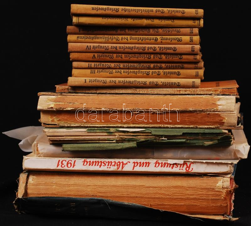 Militária könyv gyűjtemény: 15 db német nyelvű, részben magyar vonatkozású katonasággal, hadászattal foglalkozó könyv vegyes állapotban, ritkább darabokkal / cca 1910-1920 Compilation of military books written in English mostly about World War I. in different condition Die Oberste Heeresleitung 1914-1916 in ihren wichtigsten Entschließungen + Rüstung und Brüstung + Sammlung Göschen 9x + Die heere und flotten der Gegenwart Deutschland +Kämpfe in China I-II. + Österreichund Ungarn und Italie (...Adria) + Die Deutsche Armee und Weltkriege