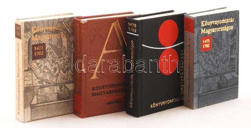 4 db miniköny: Bolgár Iván, Végh Oszkár: Könyvnyomtatás Magyarországon 1473-1702. Bp., 1973, Kossuth Kiadó. 4 különböző kötésű kiadása, ebből kettő sorszámozott, 112. számú példány, készült 1000 példányban. Kiadói díszes műbőr illetve papírkötésben, műanyag gyűjtőtokban, jó állapotban.