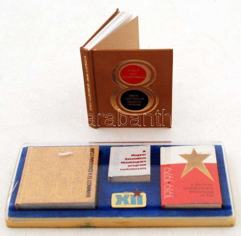 4 db minikönyv: Ady. Balázs G. Árpád nyolc Ady-illusztráció. Bp., Zrínyi Nyomda. Kiadói műbőr kötés, jó állapotban.; 35 év a szabadság útján; A Magyar Szocialista Munkáspárt programnyilatkozata; A Magyar Kommunista Mozgalom 60 éve. Kiadói kartonált kötés, jó állapotban.