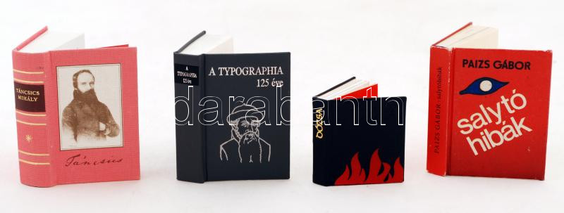 4 db minikönyv: Dózsa György és a magyar parasztháború. Bp., Zrínyi Nyomda. Kiadói műbőr kötés, jó állapotban; Táncsics Mihály és a magyarországi munkásmozgalom. 1974, Táncsics Könyvkiadó. Kiadói egészvászon kötés, jó állapotban.; Paizs Gábor: Salytó hibák. Debrecen, 1983. Kiadói kartonált kötés, jó állapotban; A typhographia 125 éve. Bp., 1994, 813. számozott kiadás. Kiadói kartonált kötés, jó állapotban.
