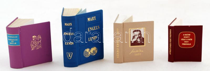 4 db minikönyv: Longosz: Daphnisz és Khloé. Bp., 1966, Magyar Helikon. Kiadói műbőr kötés, jó állapotban; Szabó Ervin. Bp., 1977, Kossuth. Kiadói kartonált kötés, jó állapotban.; A Magyar Nemzeti Függetlenségi Front programja; Részletek Marx, Engels, Lenin írásaiból és beszédeiből. Kiadói műbőr kötés, jó állapotban.
