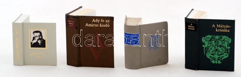 4 db minikönyv: Longosz: Daphnisz és Khloé. Bp., 1966, Magyar Helikon. Kiadói műbőr kötés, jó állapotban; Szabó Ervin. Bp., 1977, Kossuth. Kiadói kartonált kötés, jó állapotban.; Ady és az Amicus Kiadó. Bp., 1993. Kiadói műbőr kötés, 747. sorszámozott kiadás, kissé kopottas állapotban; A Mátyás-krónika. Bp., 1990. Kiadói műbőr kötés, 302. sorszámozott kiadás, kissé kopottas állapotban.