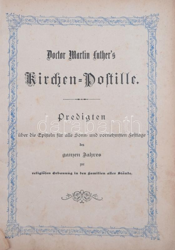 Dr. Martin Luthers Kirchen-Pastille Predigten über die Episteln für alle Sonn- und vornehmsten Festtage des ganzen Jahres, zur religiösen Erbauung in den Familien aller Stände. Dresden,é.n., Verlag christlicher Schriften Schoen & Krieger, o.J. Viseltes kiadói egészvászon kötésben.