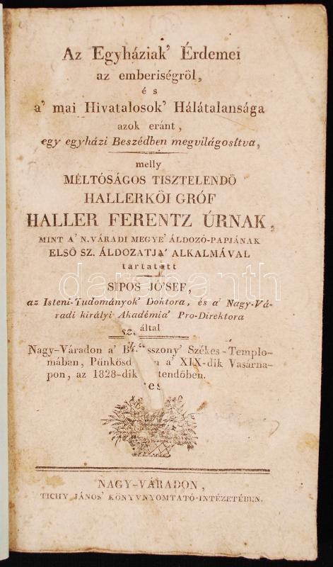 .. melly’ mélt. Tiszt. Hallerkői gróf Haller Ferentz úrnak … tartatott. Nagy-Váradon a’ B. Asszony’ Székes-Templomában, Pünkösd után a’ XIX-dik Vasárnapon, az 1828-dik esztendőben. Nagy-Váradon, 1828. Tichy János. 48 p. Fűzve.