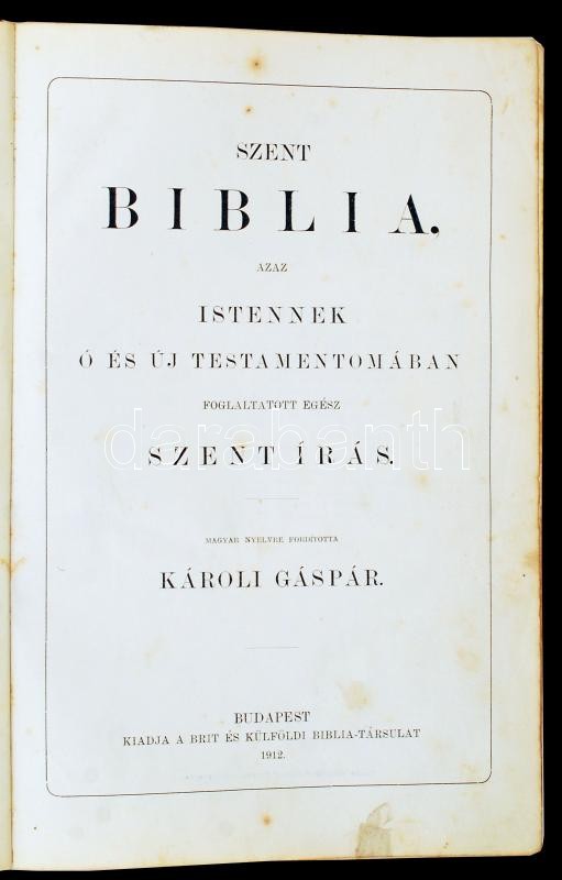 Szent Biblia azaz Istennek és új testamentomában foglatatott egész szent írás. Fordította Károli Gáspár.Budapest, 1912, Brit és Külföldi Biblia-Társulat. Kiadói egészbőr kötésben, aranyozott lapszél. A gerinc kissé szakadt, egyébként jó állapotban.