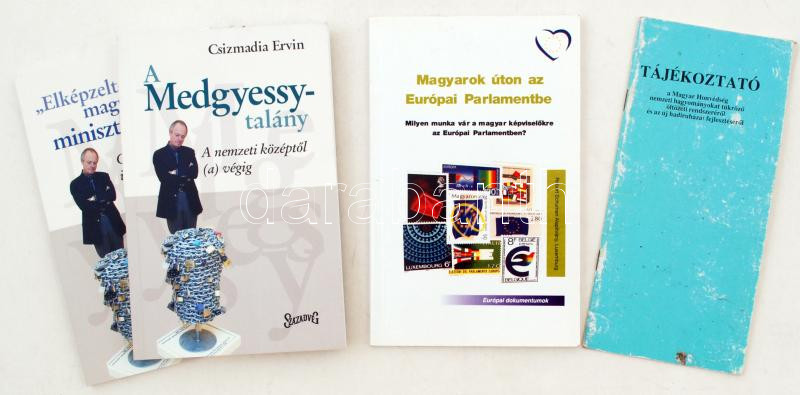 3 db könyv: Csizmadia Ervin: A Medgyessy-talány. A nemzeti középtől (a) végig. Bp., 2004, Századvég. + hozzá tartozó kiegészítőkötet: Csizmadia Ervin: "Elképzeltek maguknak egy miniszterelnököt". Interjú Medgyessy Péterrel. Bp., 2004, Századvég. Papírkötésben, jó állapotban.; Magyarok úton az Európai Parlamentbe. Milyen munka vár a magyar képviselőkre az Európai Parlamentben? Szerk.: Wahl, Jürgen. Bp., 2002, Királyi Magyar Egyetemi Nyomda. Papírkötésben, jó állapotban.; Tájékoztató a Magyar Honvédség nemzeti hagyományokat tükröző öltözeti rendszeréről és az új hadiruházat fejlesztéséről. Bp., é. n., MH Ruházati Szolgálatfőnökség. Kopottas papírkötésben, egyébként jó állapotban.