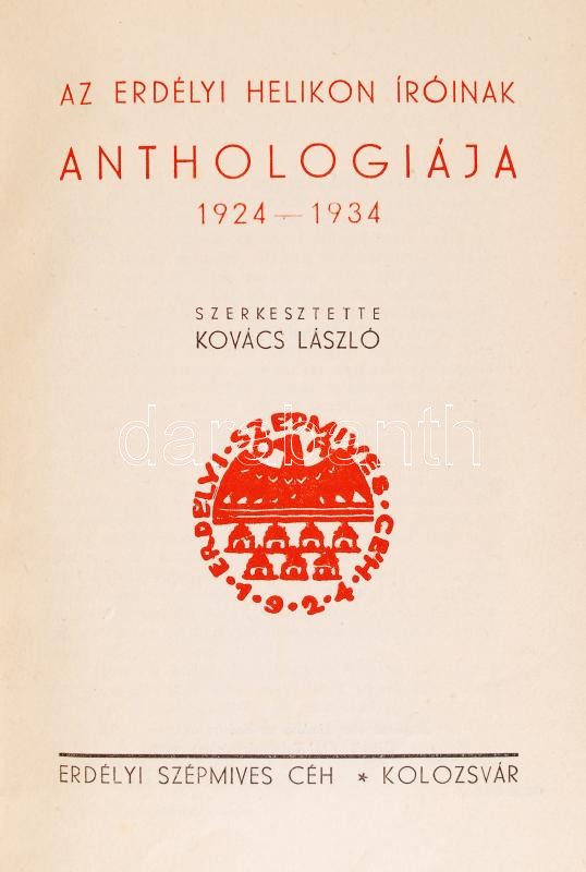 Az Erdélyi Helikon íróinak anthologiája 1924-1934. Szerk.: Kovács László. Kolozsvár, [1934], Erdélyi Szépmives Céh. Áprily Lajos, Dsida Jenő, Kós Károly, Makkai Sándor, Nyirő József, Reményik Sándor, Tamási Áron és mások írásaival. Kiadói halinakötésben, jó állapotban.