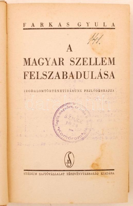 Farkas Gyula: A magyar szellem felszabadulása. Irodalomtörténetírásunk fejlődésrajza. Budapest, é.n., Stádium Sajtóvállalat. Kissé foltos, kiadói félvászon kötésben.