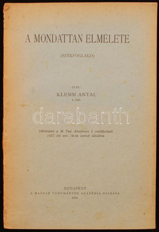 Klemm Antal: A mondattan elmélete. (székfoglaló) Budapest, 1928, Magya... https://www.darabanth.com/de/227-Fernauktion/227.0/Andere-Sammelgebiete/Bucher-Sonstige-Raritaten~200334/Klemm-Antal-A-mondattan-elmelete-szekfoglalo-Budapest-1928-Magyar-Tudomanyos-Akademia-Ki~II1009637