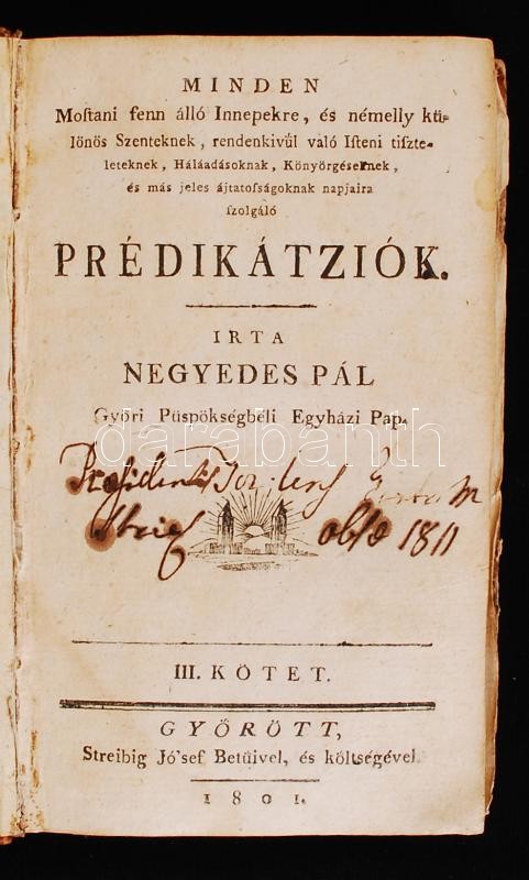 Negyedes Pál: Minden mostani fenn álló innepekre ... és más jeles ájtatosságoknak napjaira szolgáló prédikátziók. 3. köt. Győr, 1800-1801, Streibig József. Kicsit megviselt félbőr kötésben, néhol foltos.