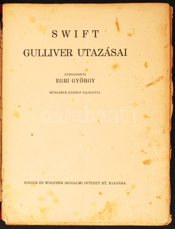Swift: Gulliver utazásai. Átdolgozta: Egri György. Mühlbeck Károly raj... https://www.darabanth.com/de/227-Fernauktion/227.0/Andere-Sammelgebiete/Bucher-Sonstige-Raritaten~200334/Swift-Gulliver-utazasai-Atdolgozta-Egri-Gyorgy-Muhlbeck-Karoly-rajzaival-Singer-es-Wolfn~II986078