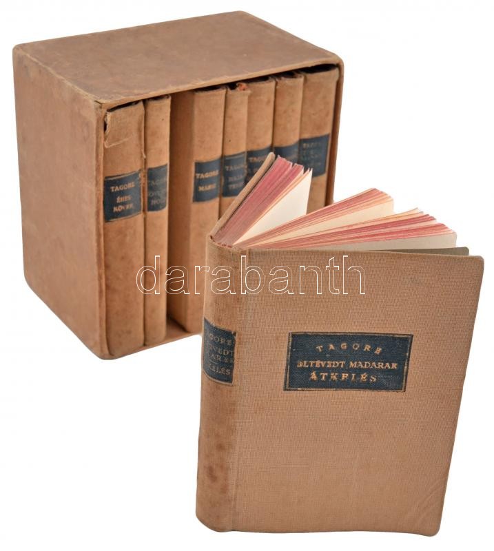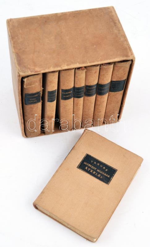 Tagore: Éhes könyvek, Növekvő hold, Mashi, Hazatérés, Eltévedt madarak, A posta hivatal, Szüret, Szerelmi ajándék, A lélek sugallata. 8 kötetes, kis méretű könyvek saját dobozban. Budapest, 1922, Pantheon. Kissé viseltes kiadói egészvászon kötésben.