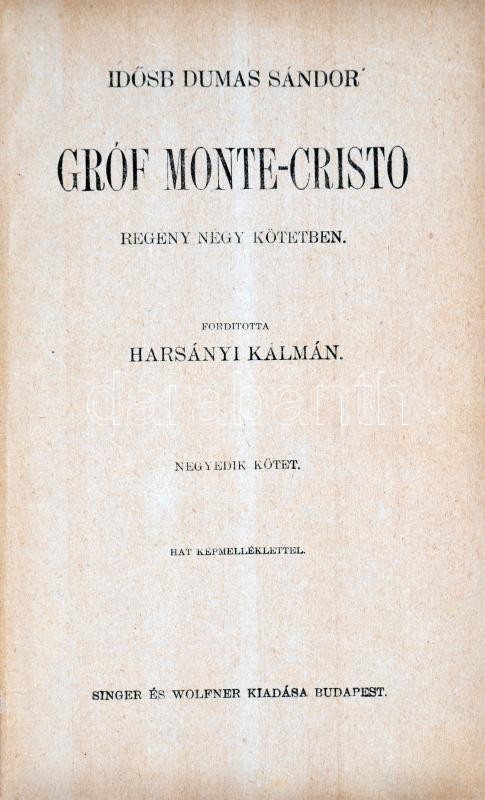 id. Dumas Sándor: Gróf Monte Cristo. 1-4. kötet, 4 kötetbe kötve. É.n., Singer és Wolfner. Kissé viseltes kiadói, színes, illusztrált vászonkötésben, több kép melléklettel.