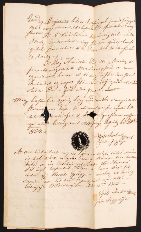 Beschreibung: 1855 Közlevél melyben nyilvánosságra hozzák, hogy három egymást követő évre haszonbérbe adják a Besenyői szőlő birtokot. 34x20cm