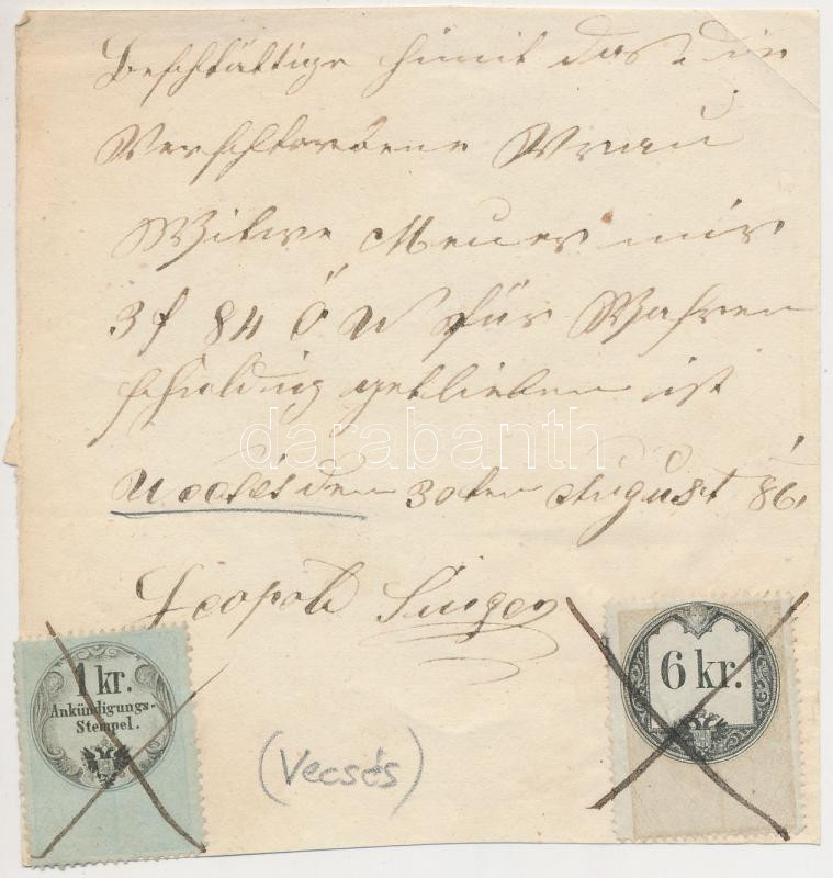 1861 6kr okmánybélyeg + 1kr hirdetménybélyeg okmányon https://www.darabanth.com/de/227-Fernauktion/227.0/Andere-Sammelgebiete/Dokument~200340/1861-6kr-okmanybelyeg-plus-1kr-hirdetmenybelyeg-okmanyon~II1012574