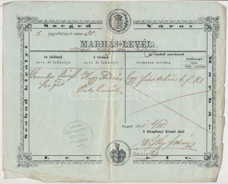 1861 Szeged, Marhalevél Szeged Város Kapitány Hivatal pecsétjével https://www.darabanth.com/de/227-Fernauktion/227.0/Andere-Sammelgebiete/Dokument~200340/1861-Szeged-Marhalevel-Szeged-Varos-Kapitany-Hivatal-pecsetjevel~II1009434