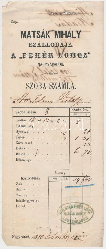 1870 Nagyvárad, Matsák Mihály Szállodája a Fehér Lóhoz fejléces számla... https://www.darabanth.com/de/227-Fernauktion/227.0/Andere-Sammelgebiete/Dokument~200340/1870-Nagyvarad-Matsak-Mihaly-Szallodaja-a-Feher-Lohoz-fejleces-szamla-szallodai-pecsette~II1011535