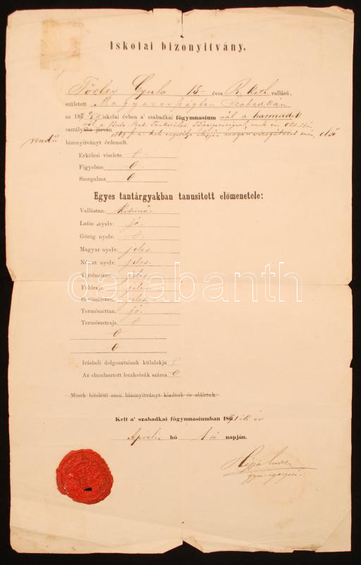 1871 Szabadkai gimnázium bizonyítványa Törley Gyula részére viaszpecsé... https://www.darabanth.com/de/227-Fernauktion/227.0/Andere-Sammelgebiete/Dokument~200340/1871-Szabadkai-gimnazium-bizonyitvanya-Torley-Gyula-reszere-viaszpecsettel~II1006907