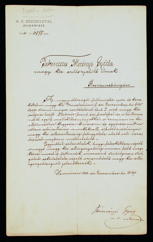 1884 M. K. Erdőhivatal Zsarnóczán erdészi kinevezése Merényi Gyula Besztercebányai lakosnak, fizetés meghatározással, magy. kir. erdő igazgatóságnál való jelentkezési felhívással.