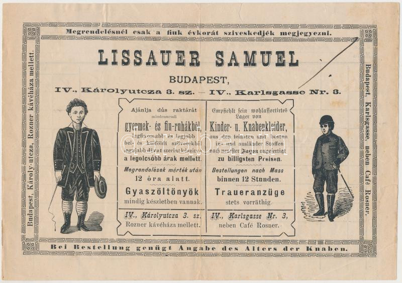 1888 Bp. IV., Ifj. Lissauer Samuel Gyermek- és Fiúruha Raktárának dísz... https://www.darabanth.com/de/227-Fernauktion/227.0/Andere-Sammelgebiete/Dokument~200340/1888-Bp-IV-Ifj-Lissauer-Samuel-Gyermek-es-Fiuruha-Raktaranak-diszes-fejleces-szamlaja~II1011645