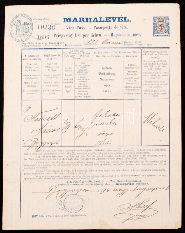 1894 Bogyoszló, Marhalevél oválbélyegzővel https://www.darabanth.com/de/227-Fernauktion/227.0/Andere-Sammelgebiete/Dokument~200340/1894-Bogyoszlo-Marhalevel-ovalbelyegzovel~II1009620
