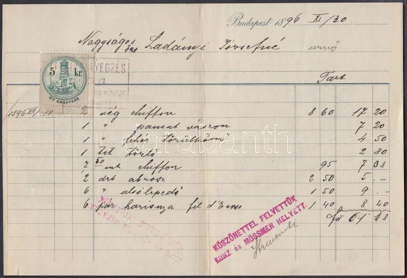 Beschreibung: 1896 Bp. Kígyó tér(Ferenciek tere), Kunz és Mössner Asztalnemű, Vászon és Fehérnemű, Menyasszonyi kelengyék boltjának díszes fejléces számlája 5 kr okmánybélyeggel