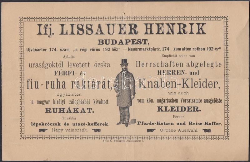 1898 Bp. Újvásártér(Erzsébet tér), Ifj. Lissauer Henrik Férfi- és Fiúr... https://www.darabanth.com/de/227-Fernauktion/227.0/Andere-Sammelgebiete/Dokument~200340/1898-Bp-UjvasarterErzsebet-ter-Ifj-Lissauer-Henrik-Ferfi-es-Fiuruha-Raktaranak-dis~II1011465