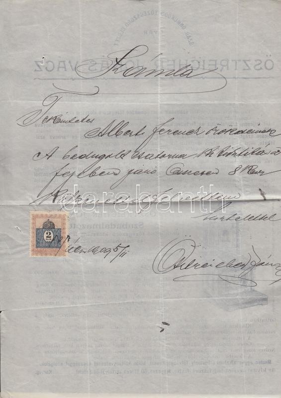 Beschreibung: 1909 Vác, Ösztreicher Jónás Szabadalmazott Tőzegszóró Clozetjének leírása, hátoldalán számlával, 2f okmánybélyeggel