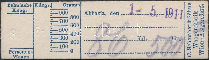 Beschreibung: 1911 Abbazia, v. Milanovits déli strand mérlegjegy / Spezielle Kurwage, Milanovits, Abbazia nur Südstrand.
