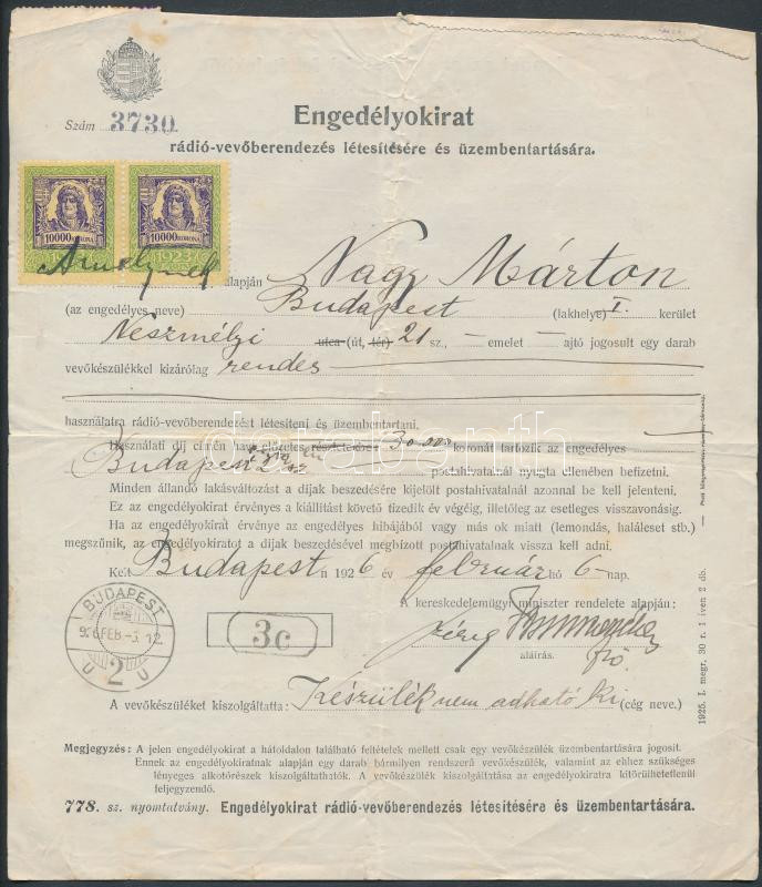 1926 Bp., Korai engedélyokirat rádió-vevőberendezés létesítésére és üz... https://www.darabanth.com/de/227-Fernauktion/227.0/Andere-Sammelgebiete/Dokument~200340/1926-Bp-Korai-engedelyokirat-radio-vevoberendezes-letesitesere-es-uzemben-tartasara-2~II1012285