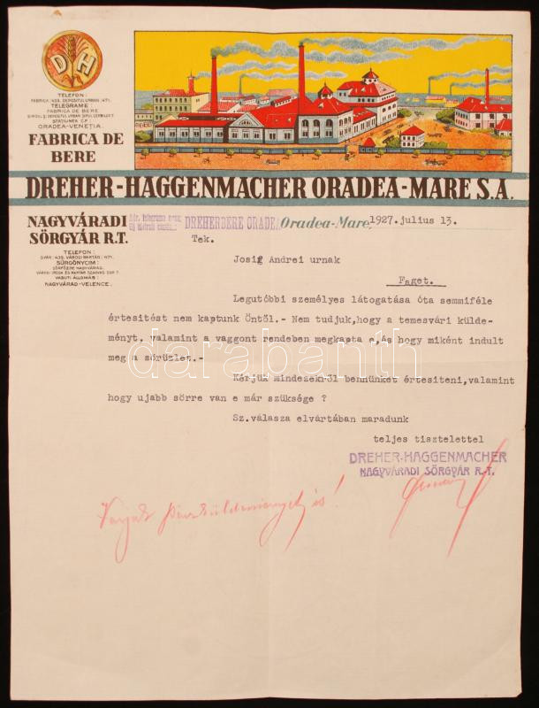 1927 Nagyvárad, a Dreher-Haggenmacher Nagyváradi Sörgyár Rt. díszes, s... https://www.darabanth.com/de/227-Fernauktion/227.0/Andere-Sammelgebiete/Dokument~200340/1927-Nagyvarad-a-Dreher-Haggenmacher-Nagyvaradi-Sorgyar-Rt-diszes-szinezett-fejleces-level~II1009442