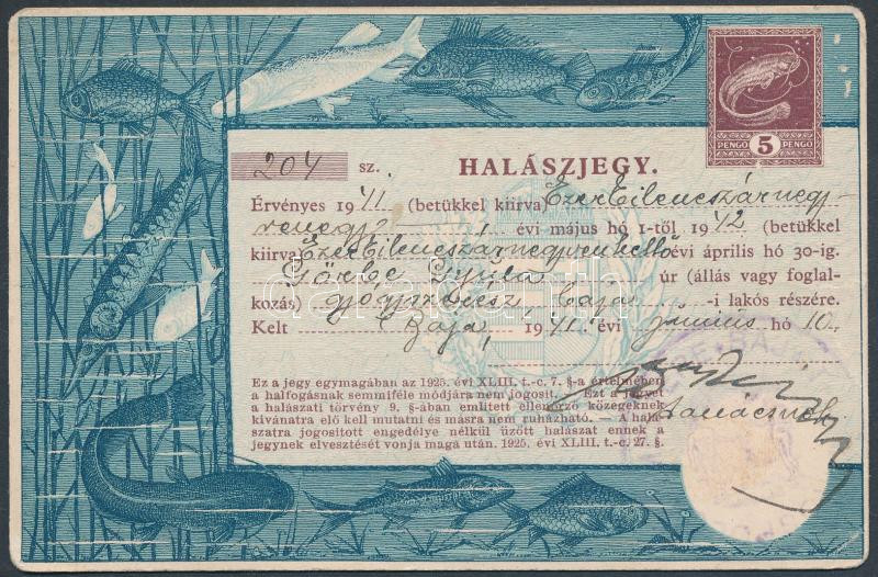 1941 Halászjegy 5P benyomott okmánybélyeggel, Baján felhasználva / Fis... https://www.darabanth.com/de/227-Fernauktion/227.0/Andere-Sammelgebiete/Dokument~200340/1941-Halaszjegy-5P-benyomott-okmanybelyeggel-Bajan-felhasznalva-Fishing-ticket~II1003789
