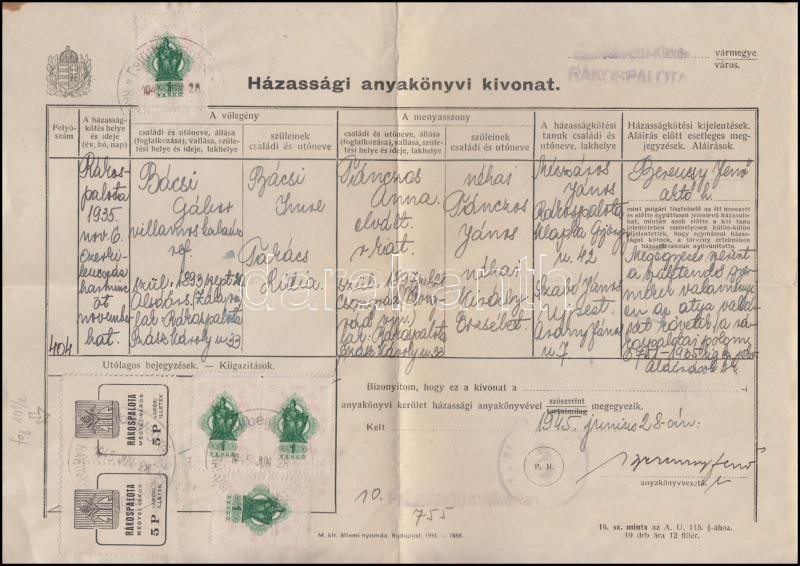 1945 Házassági anyakönyvi kivonat 6 db okmánybélyeggel, közte Rákospal... https://www.darabanth.com/de/227-Fernauktion/227.0/Andere-Sammelgebiete/Dokument~200340/1945-Hazassagi-anyakonyvi-kivonat-6-db-okmanybelyeggel-kozte-Rakospalota~II1012724