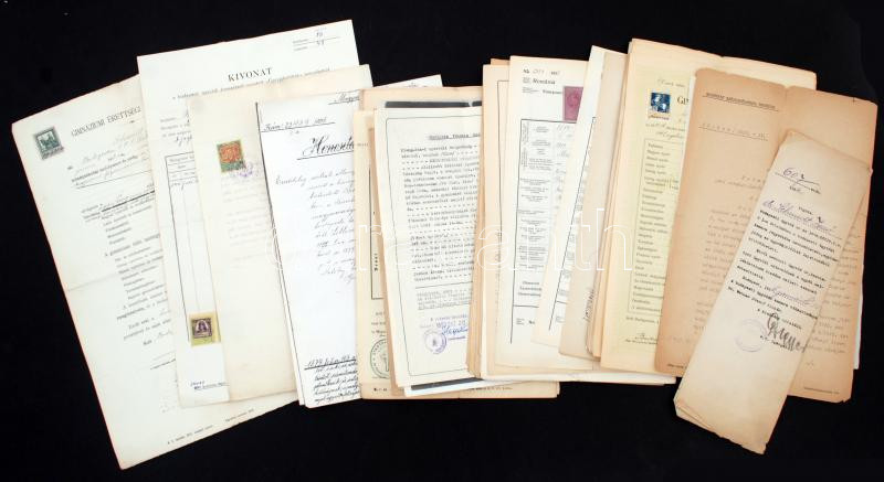 cca 1910 -1950 Vegyes okmány tétel, magánokiratok, (az okmányok egy része amerikai migrációhoz összegyűjtve, származási igazolások, keresztlevelek, bizonyítványok, a házassági levelek stb.)cca 50db, némely illetékbélyeggel ellátva.