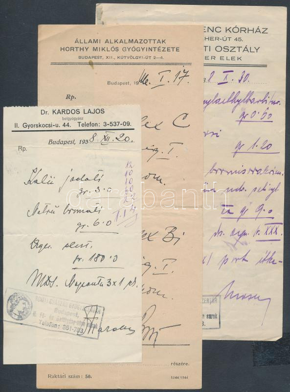 cca 1938 Receptek, 3db különféle, Kiadva: Állami Alkalmazottak Horthy Miklós Gyógyintézete, Assisi Szent Ferenc Kórház, Dr. Kardos Lajos (Gyorskocsi u.)
