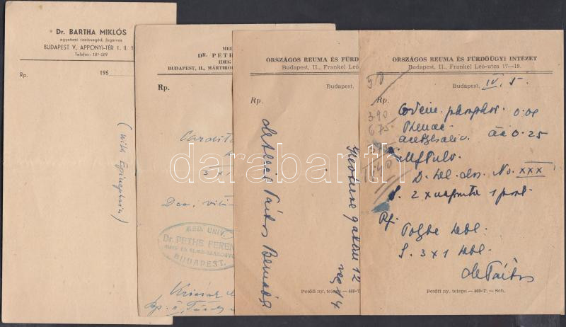 Beschreibung: cca 1956 Receptek, 4db különféle, Kiadva: Országos Reuma és Fürdőügyi Intézet, Dr. Pethe Ferenc Ideg szakorvos, Dr. Bartha Miklós fogorvos által