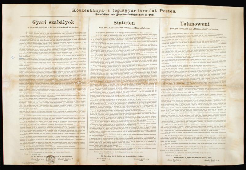 Beschreibung: 1886 Bp., Kőszénbánya- és téglagyár-társulat gyári szabályai, nagyméretű háromnyelvű plakát, 92x62 cm