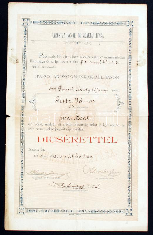 1893 Iparostanonczok munkakiállítása Pretz Jánost, mint jó igyekezetű... https://www.darabanth.com/de/227-Fernauktion/227.0/Andere-Sammelgebiete/Drucksachen~200312/1893-Iparostanonczok-munkakiallitasa-Pretz-Janost-mint-jo-igyekezetu-es-szep-remenyekre-j~II1008549