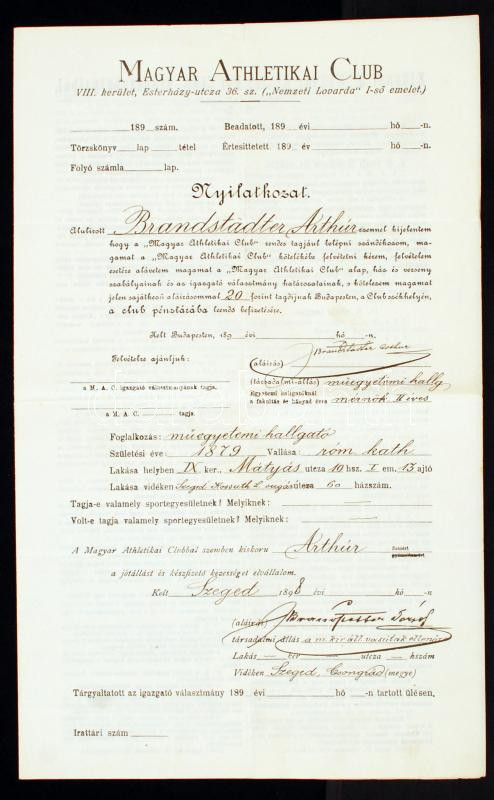 1898 Magyar Athletikai Club tagbelépési nyilatkozat és alapszabályzat. https://www.darabanth.com/de/227-Fernauktion/227.0/Andere-Sammelgebiete/Drucksachen~200312/1898-Magyar-Athletikai-Club-tagbelepesi-nyilatkozat-es-alapszabalyzat~II1006548