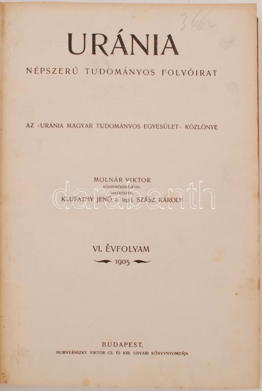 1905 Uránia. Népszerű tudományos folyóirat. VI. évfolyam. 1-12. szám. Teljes, hiánytalan! Szerk. Klupathy Jenő és legifj. Szász Károly.