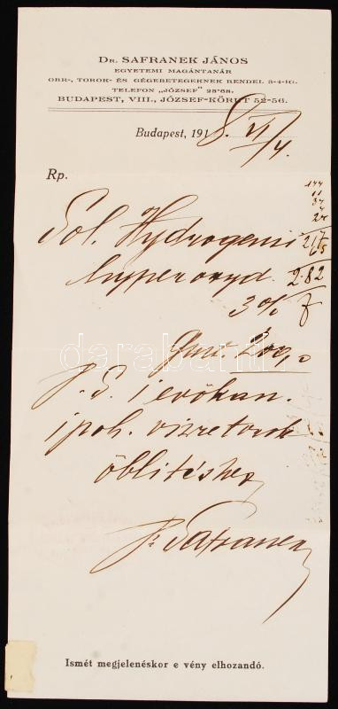 1908 Dr. Safranek János egyetemi tanár, orr-, torok- és gégebetegek or... https://www.darabanth.com/de/227-Fernauktion/227.0/Andere-Sammelgebiete/Drucksachen~200312/1908-Dr-Safranek-Janos-egyetemi-tanar-orr--torok-es-gegebetegek-orvosanak-receptje~II960979