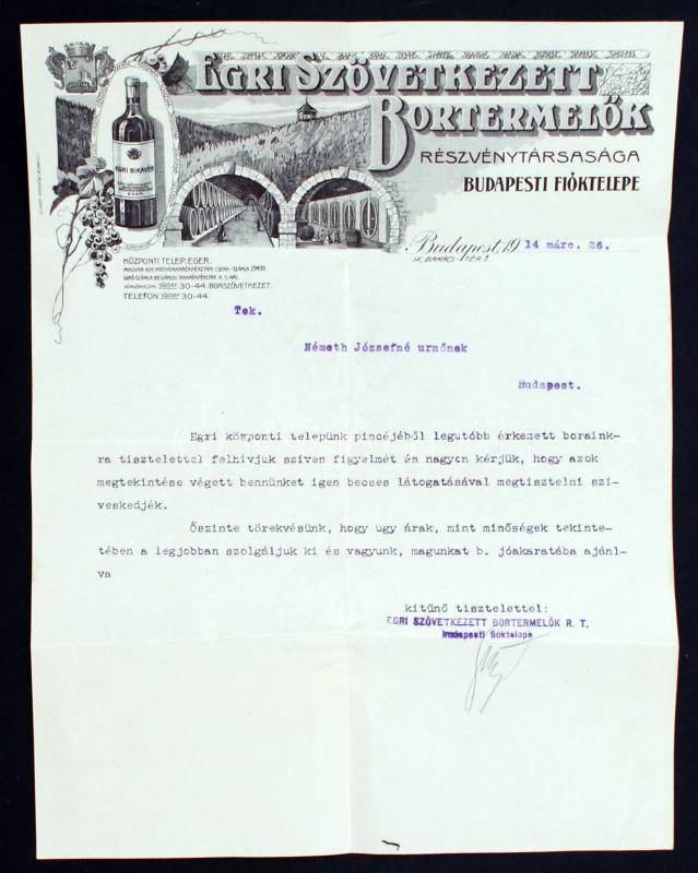1914 Egri Szövetkezett Bortermelők fejléces számlalevél https://www.darabanth.com/de/227-Fernauktion/227.0/Andere-Sammelgebiete/Drucksachen~200312/1914-Egri-Szovetkezett-Bortermelok-fejleces-szamlalevel~II1007482