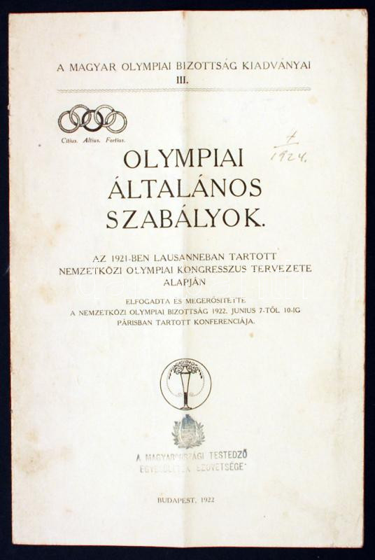 1922 Bp., Olympiai általános szabályok, az 1921-ben Lauasanneban tartott Nemzetközi Olympiai Kongresszus tervezete alapján, A Magyar Olympiai Bizottság kiadványa, 8p
