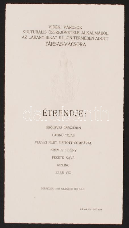 Beschreibung: 1928 Debrecen, A vidéki városok kulturális összejövetel alkalmából az Arany-Bika külön termében tartott társas vacsora étrendje Debrecen dombornyomott címerével
