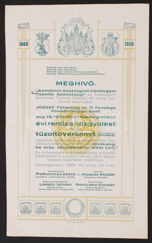 Beschreibung: 1928 Meghívó a József főherceg fővédnöksége alatt működő Komárom-Esztergom Vármegyei Tűzoltó Szövetség évi rendes közgyűlésére és tűzoltóversenyére