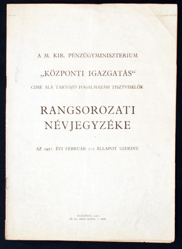 1937 A. M.Kir. Pénzügyminisztérium "központi igazgatás" címe alá tarto... https://www.darabanth.com/de/227-Fernauktion/227.0/Andere-Sammelgebiete/Drucksachen~200312/1937-A-MKir-Penzugyminiszterium-kozponti-igazgatas-cime-ala-tartozo-fogalmazasi-tisztv~II1005464